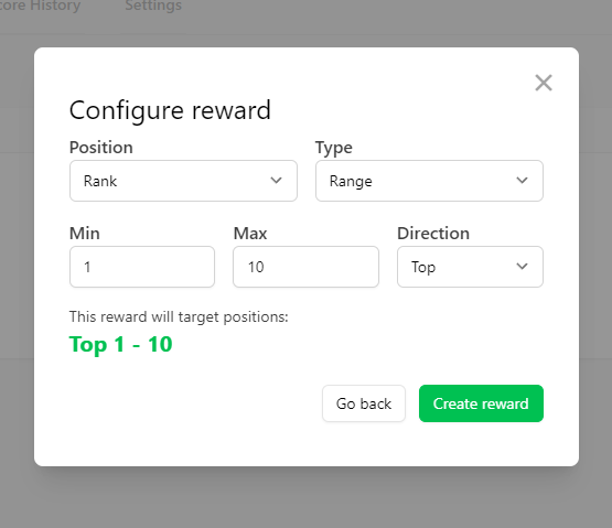 Here we have configured the selection to use the players ranking, in between a range of min 1 and max 10, this will result in the top 10 players recieving the reward.