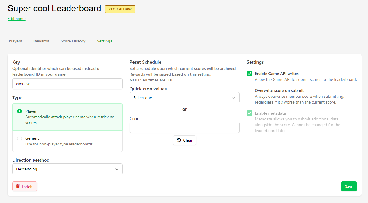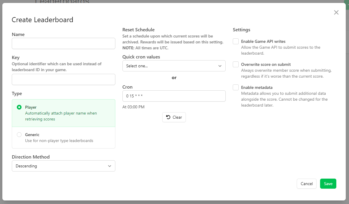 <figure><img src="https://534367586-files.gitbook.io/~/files/v0/b/gitbook-x-prod.appspot.com/o/spaces%2F-MVu1MPzezO-NgvC98xh%2Fuploads%2Fgit-blob-40a75db714d83a2e586ed94040564ca451468cf9%2Fimage.png?alt=media" alt=""><figcaption><p>In the example we set 0 15 * * * for the Leaderboard to reset everyday at 3 pm</p></figcaption></figure>