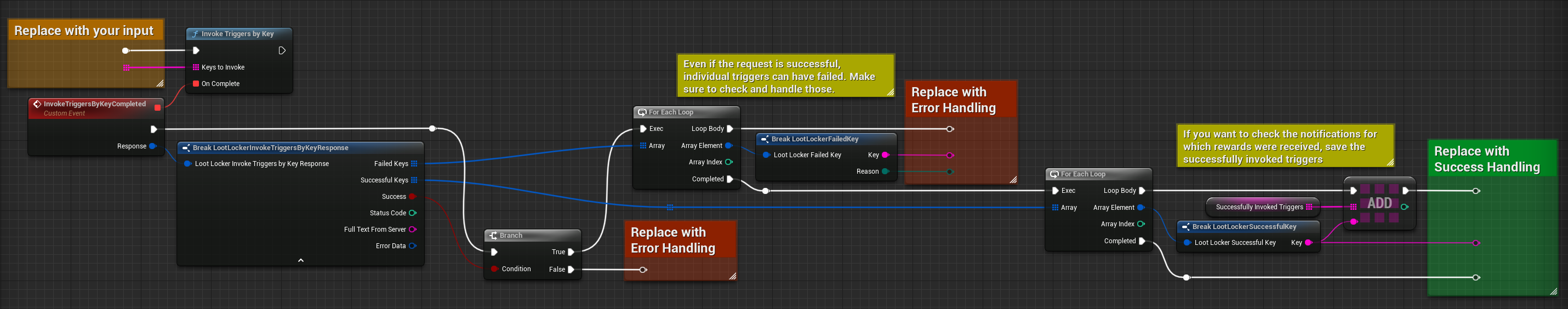 * And secondly, the returned information does not tell you what has been rewarded to the player. For that you will want to check the player's [notifications](https://docs.lootlocker.com/shared-systems/notifications/how-to/list-notifications-mark-read). If you want to do this, then you will want to store the keys of the sucessfully invoked triggers to identify which notifications correspond to which trigger.