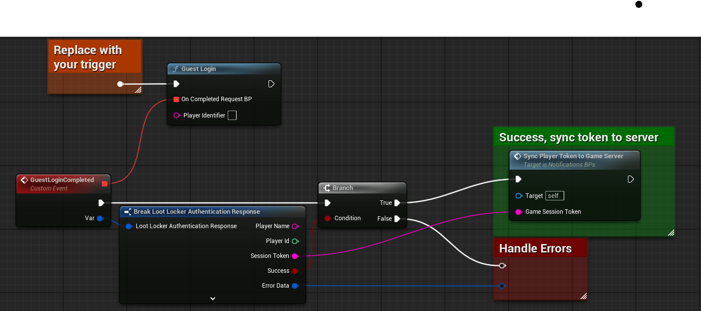 <figure><img src="https://534367586-files.gitbook.io/~/files/v0/b/gitbook-x-prod.appspot.com/o/spaces%2F-MVu1MPzezO-NgvC98xh%2Fuploads%2Fgit-blob-78e79d87f7b1fb15d2a232e419f43321876a9771%2Funreal-blueprint-sync-token-to-server.png?alt=media" alt=""><figcaption><p><a href="https://blueprintue.com/blueprint/0-76_4uk">Blueprint for Starting a Guest Session and syncing the session token to the game server</a></p></figcaption></figure>