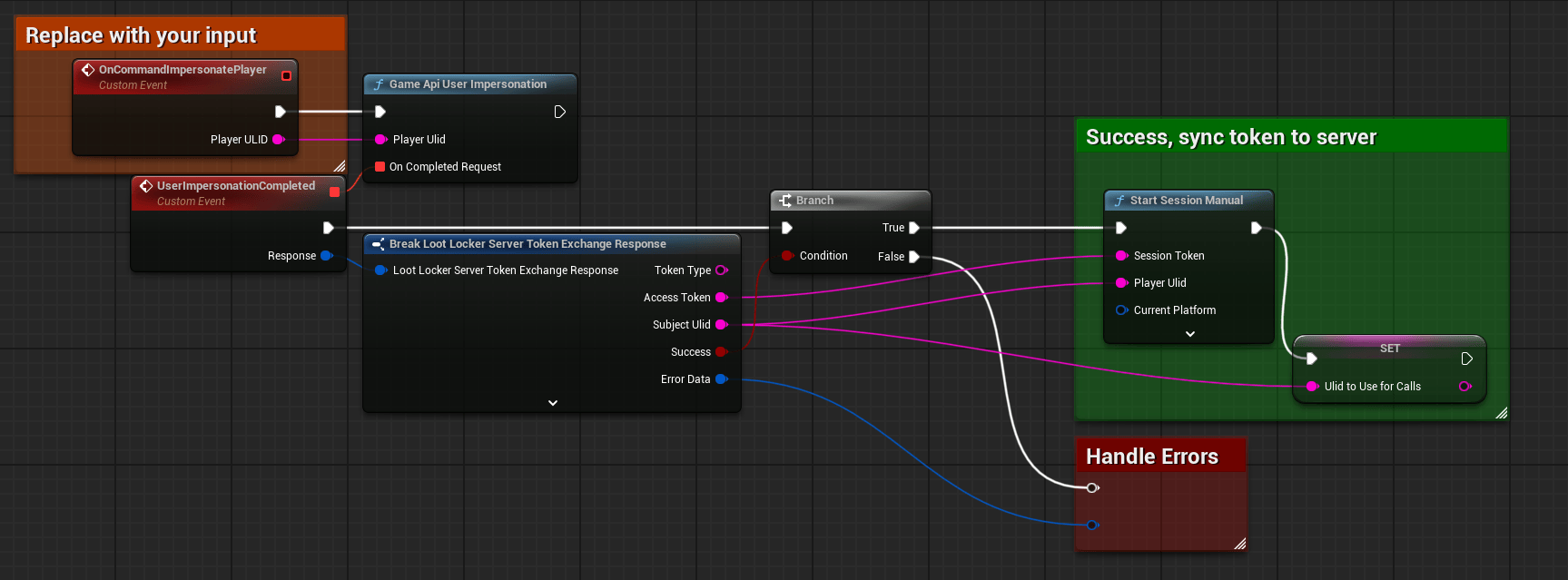 <figure><img src="https://534367586-files.gitbook.io/~/files/v0/b/gitbook-x-prod.appspot.com/o/spaces%2F-MVu1MPzezO-NgvC98xh%2Fuploads%2Fgit-blob-9129232956b495c0803c7f562d5ba40ad7f56185%2Funreal-blueprint-user-impersonation.png?alt=media" alt=""><figcaption><p><a href="https://blueprintue.com/blueprint/ux_lfr_5">Blueprint illustrating user impersonation using player ulid on the game server</a></p></figcaption></figure>