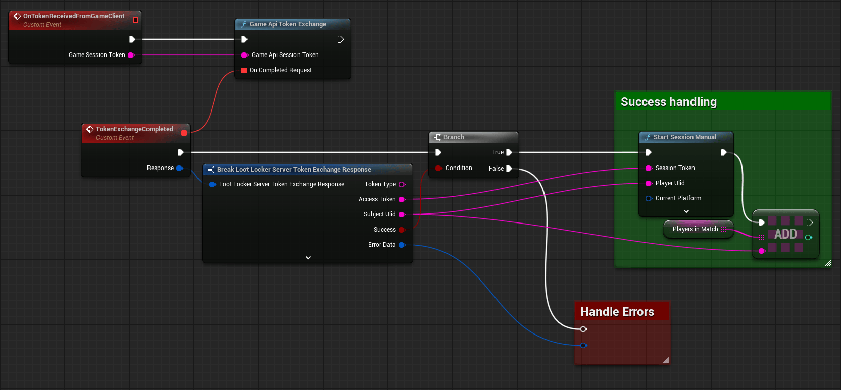 <figure><img src="https://534367586-files.gitbook.io/~/files/v0/b/gitbook-x-prod.appspot.com/o/spaces%2F-MVu1MPzezO-NgvC98xh%2Fuploads%2Fgit-blob-c54821bc35418888ccf52b3168a92ac26a11cbc6%2Funreal-blueprint-token-exchange.png?alt=media" alt=""><figcaption><p><a href="https://blueprintue.com/blueprint/5wop8g_6">Blueprint illustrating token exchange on the game server</a></p></figcaption></figure>