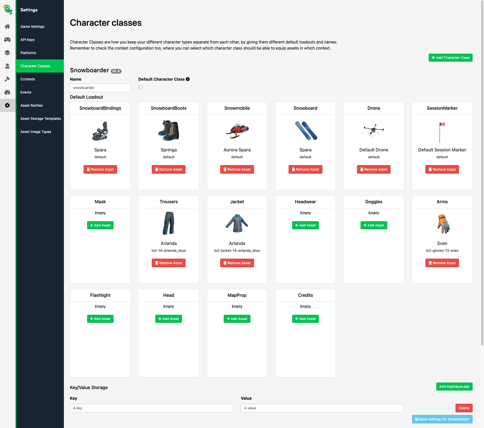 The default loadout of a character class is used to define what assets a player with the specific character class will be assigned and equipped when their character is created. The default loadout will display empty asset contexts loadout slots that have been assigned to this character class in the [Context Configuration](https://docs.lootlocker.com/admin/game-settings#context-configuration) menu.